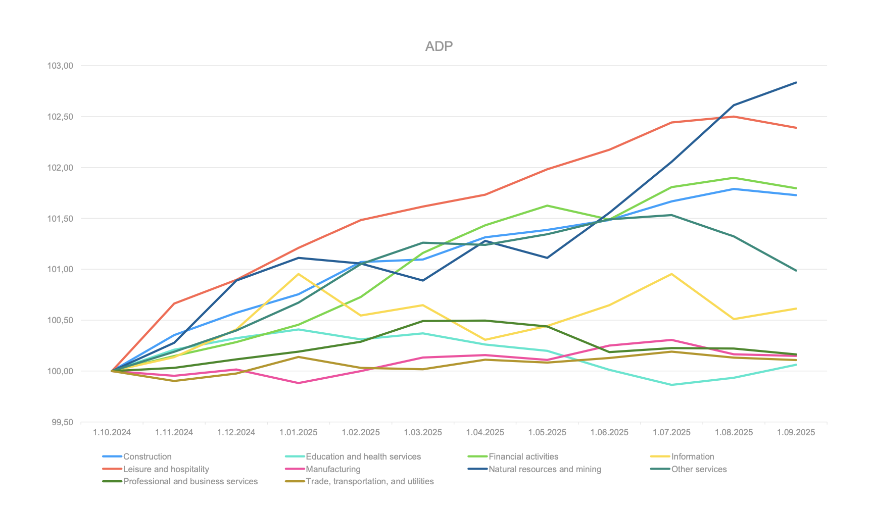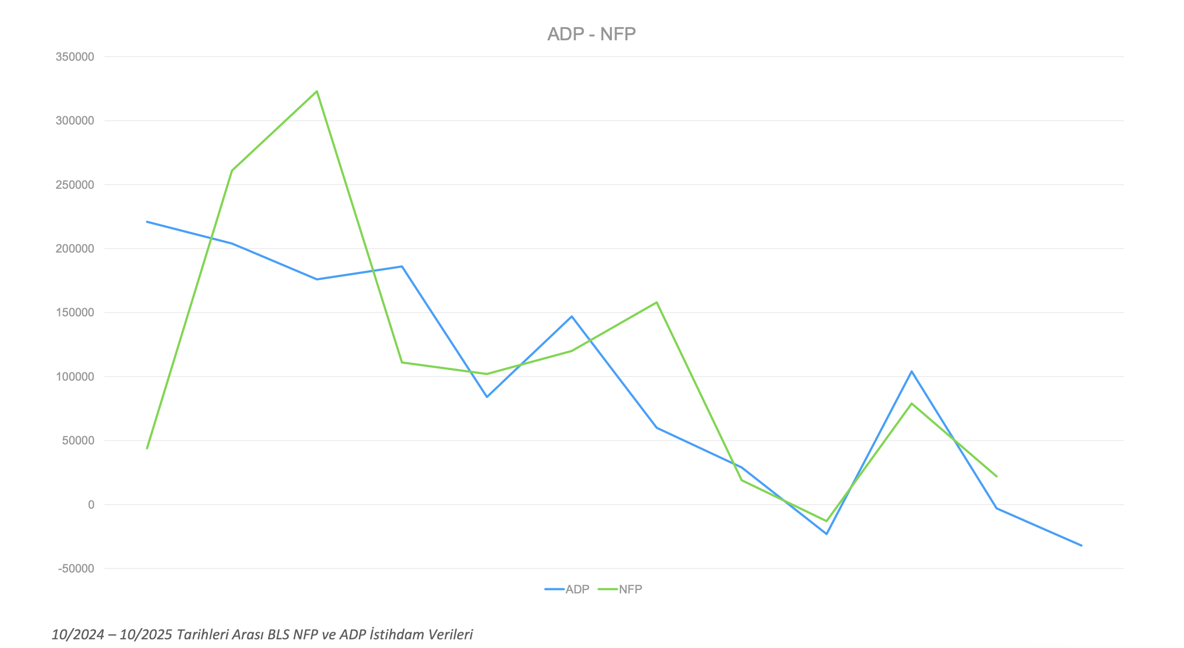 ADP özel sektör verileri incelendiğinde ise aynı dönemde ve aynı şekilde indirgenmiş grafikte farklı noktalar dikkat çekiyor. Özellikle Temmuz 2025 tarihinden itibaren istihdam kalemlerinde negatif bir eğilim söz konusu (Doğal kaynaklar ve madencilik hariç).