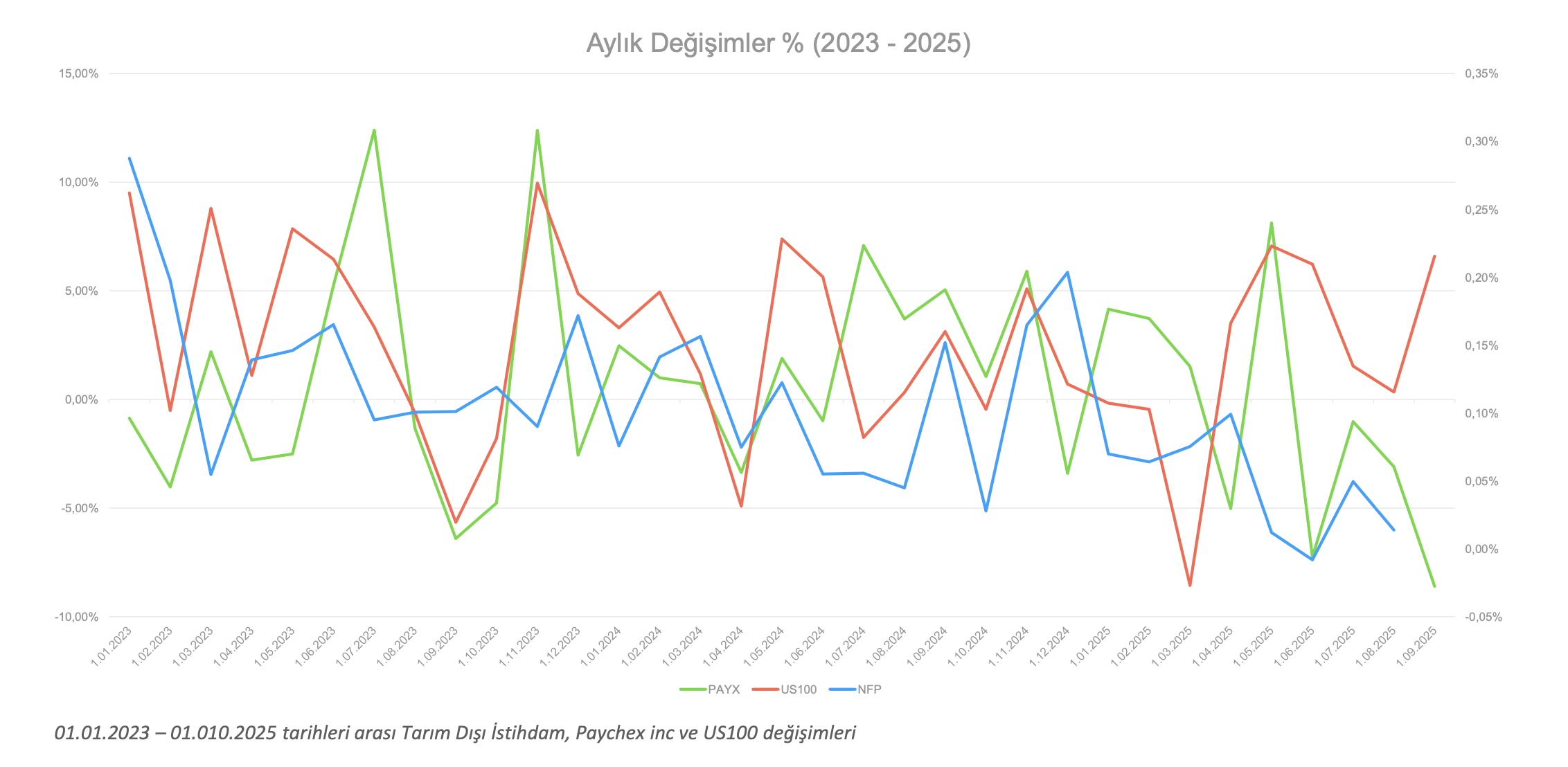 Tarım Dışı İstihdam (NFP) verileri, yayın tarihi olarak bir önceki aya ait istihdamı raporlamaktadır. Bu sebeple US100 ile PAYX fiyat verilerini kıyaslarken bu detayın atlanmaması gerekiyor. Amaç, istihdamın arttığı veya azaldığı ay içerisinde hisse senetlerinin performanslarını incelemek olduğu için istihdam korelasyonu değerlendirirken ayın ilk haftasında gelen NFP verileri ile önceki ayın hisse performansları daha tutarlı bir sonuç verecektir. Grafikte de veriler bu şekilde düzenlenmiştir.