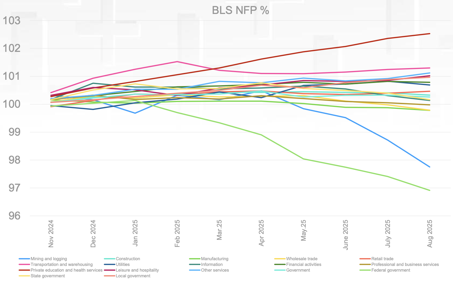BLS’in NFP verisindeki sektörler 100 değerine indirgenerek değişimleri incelendiğinde şaşırtıcı olmayacak şekilde hükümet istihdamının azaldığı görülüyor. Bu durum, Trump’ın seçildiği günden itibaren yaptığı gelişmeler sonucunda beklentiler ile örtüşür durumda.