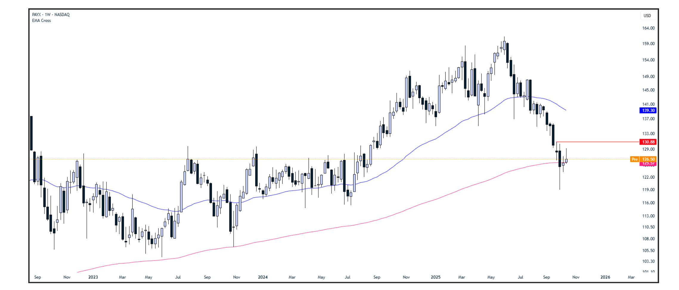 Grafiğin analizine geçmeden önce Paychex şirketinden bahsetmekte fayda var. Paychex, 1971 yılında Tom Golisano tarafından kurulmuş ve merkezi New York, Rochester'da bulunan halka açık bir Amerikan şirketidir. Şirket, küçük ve orta ölçekli işletmelere maaş, insan kaynakları, sigorta ve emeklilik gibi alanlarda entegre insan sermayesi yönetimi çözümleri ve hizmetleri sunmaktadır. Bulut tabanlı platformu üzerinden müşterilerinin bordro süreçlerini, İK görevlerini ve yan haklar yönetimini kolaylaştırmayı amaçlamaktadır.