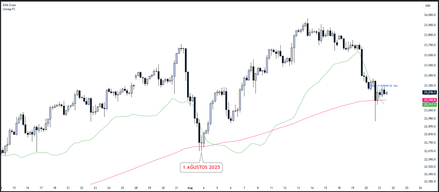 Öte yandan bilanço açıklama dönemini yavaş yavaş geride bırakıyoruz. Teknoloji tarafı başta olmak üzere genel anlamda pozitif bir bilanço dönemi geçirildi. Bunun sonucunda fiyatlar yüksek volatilite ile yükseldi. Nispeten şiddetli geçen yükseliş dönemlerinden sonra bir miktar geri çekilmeler, fiyatın doğal akışında bulunan ve olağan görülebilecek düşüşler olabilir. ABD borsaları için bu düşüş, trend dahilinde oldukça önemli bir düşüştü. Temmuz ayının başından süre gelen regresyon trendi hala yükseliş yönlü devam ediyor. Geçtiğimiz günlerdeki düşüş, fiyatın regresyon trendinin alt sapma sınırlarının dışında doğru gerçekleşti. Ek olarak 4 saatlik grafikteki ağırlıklı ortalama fiyatına gelerek denge noktasını yeniden test etmiş oldu. Aynı fiyat hareketi, ağustos ayı başından itibaren yükselişin başladığı noktada benzer şekilde tezahür etmişti.