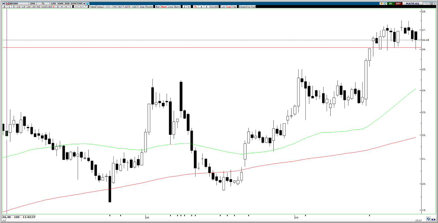 Teknik değerlendirme: BIOEN, günün ilk saatlerinde Borsa İstanbul’un genelindeki satış sonrası hızlı bir toparlanma gösterdi. Henüz günlük açılış fiyatının altında seyrediyor. Kırmızı çizgi ile belirtilen 26,1 seviyesi ihlal edilmediği sürece yükseliş yönlü fiyat hareketlerinin oluşma ihtimalinde artış olabilir. Potansiyel hedefler arasında 26,7 ve 27,2 bulunuyor.