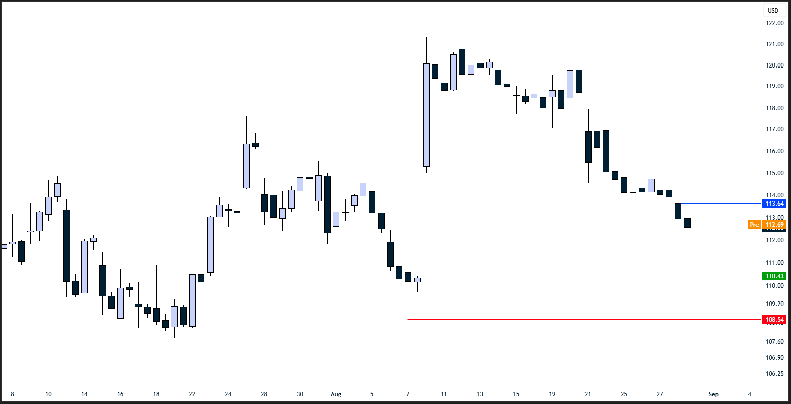 Teknik değerlendirme: GILD fiyatı 4 saatlik grafikte önemli bir fiyat boşluğu içerisinde yer alıyor. Bilanço döneminin de pozitif etkisiyle ağustos ayının başlarından itibaren %10’a yakın yükseliş gösteren hisse, düşüş eğiliminde bir süreç yaşıyor. Fiyatın geldiği konum itibariye önemli bir destek seviyesini test ediyor olabilir. Güncel fiyat olan 112,56 ile 110,43 aralığı önemli destek seviyesi olabilir. Kritik seviye olarak 108,5 seviyesi karşımıza çıkıyor. Potansiyel hedef ise 113,64 olabilir.