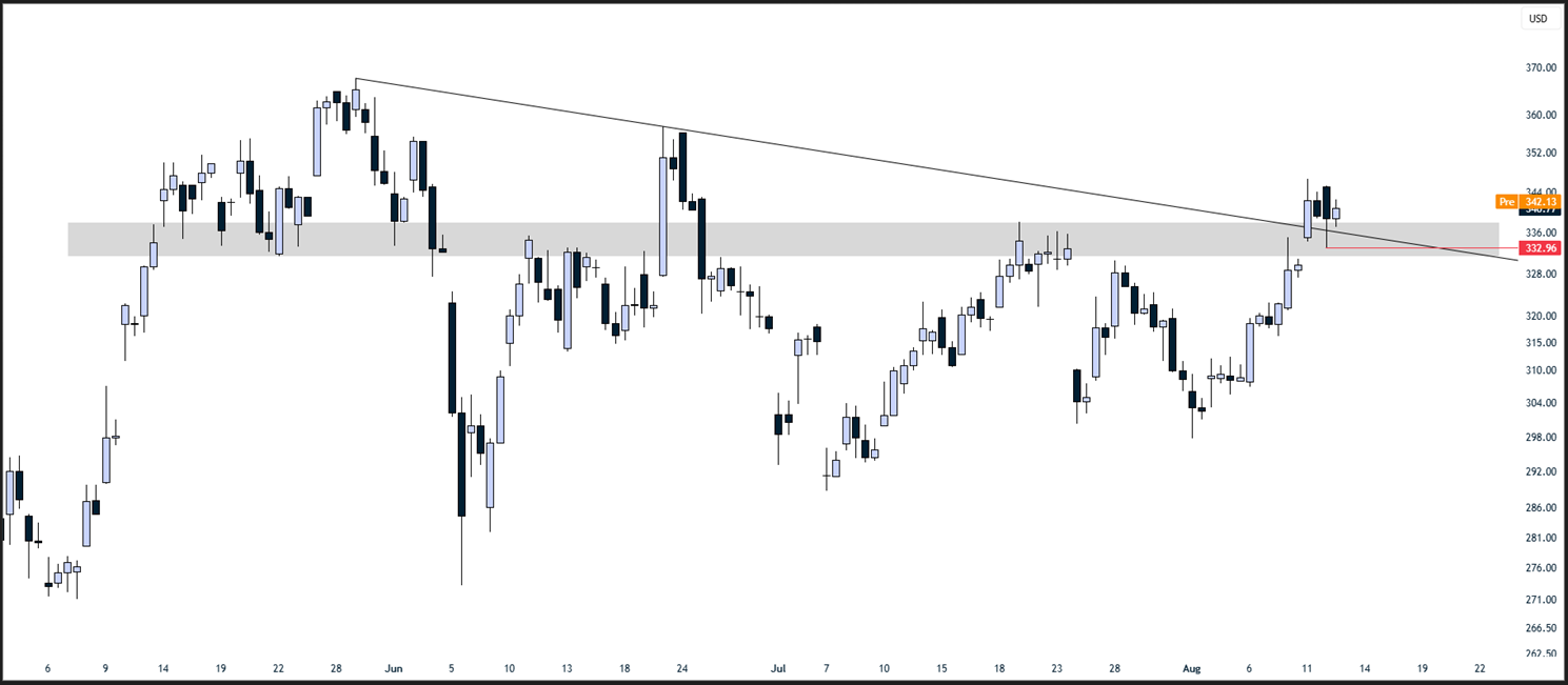 Teknik olarak TSLA, haftaya pozitif başladı. Daha önce çok defa hem destek hem de direnç görevi görmüş olan 331 – 338 fiyat aralığının üzerine çıkmış durumda. Aynı zamanda 4 saatlik grafikteki düşen trend çizgisinin de üzerinde fiyatlanıyor. Kırmızı çizgi ile belirtilen 332 dolar seviyesinin altında uzun süreli fiyatlamalar olmaması durumunda yükseliş veya yatay fiyat hareketlerinin görülme ihtimali artabilir. Aksi halde fiyat, ağırlıklı ortalama fiyatlara doğru aşağı yönlü geri çekilme evresine geçebilir.