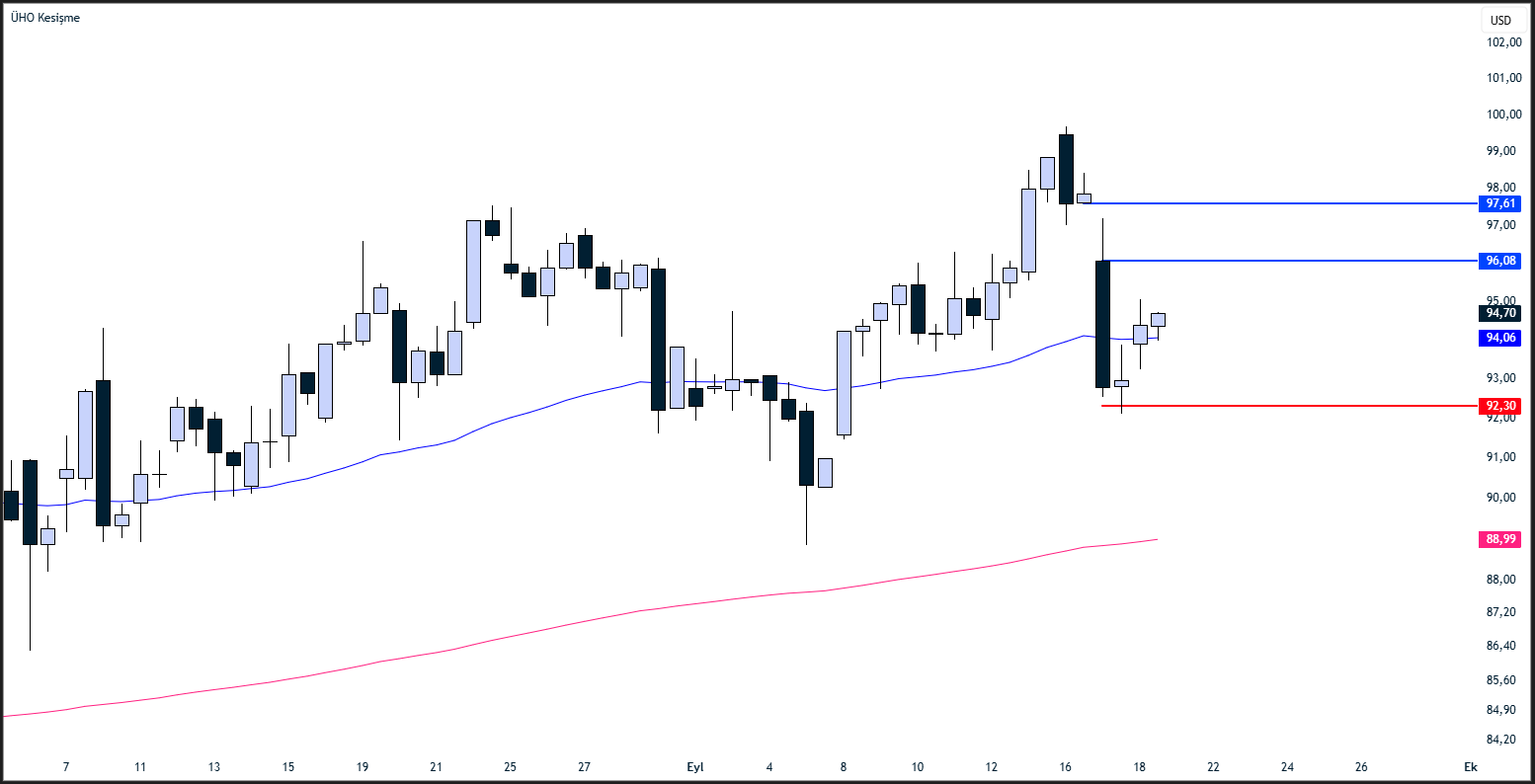 Teknik değerlendirme: UBER, 4 saatlik grafikte 50 barlık üssel hareketli ortalamanın hemen üzerinde seyrediyor. Kırmızı çizgi ile belirtilen 92,30 seviyesi ihlal edilmediği sürece yükseliş yönlü fiyat hareketlerinin oluşma ihtimalinde artış olabilir. Potansiyel hedefler arasında 96,08 ve 97,61 bölgeleri bulunuyor.