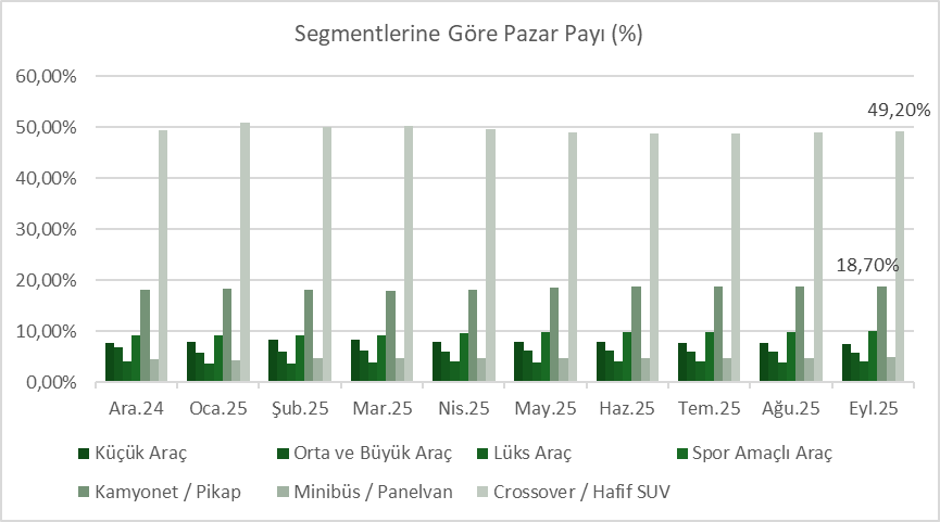 2025 Eylül itibarıyla ABD otomotiv pazarında segment dağılımı büyük ölçüde dengeli seyrederken, crossover/hafif SUV modelleri %49,2’lik payla liderliğini korudu. Kamyonet ve pikaplar %18,7 ile ikinci sırada yer alırken, spor amaçlı araçların payı %10 seviyesine yükseldi. Küçük araçlar %7,5’e gerilerken, orta ve büyük araç segmenti %5,8 pay aldı.Lüks araçlar %4,0 payla sınırlı bir kitleye hitap etmeyi sürdürürken, minibüs ve panelvan segmenti hafif artışla %4,8’e çıktı. Bu dağılım, ABD’de tüketicilerin SUV ve kamyonetleri tercih etmeye devam ettiğini ortaya koyuyor.
