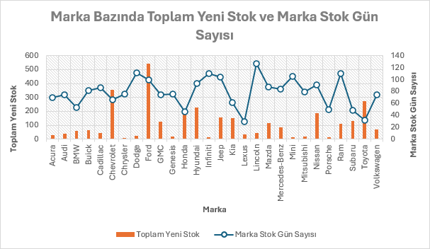 Haziran 2025 itibarıyla ABD’deki otomobil markaları arasında stok düzeyleri ve stok gün sayıları farklılıklar gösteriyor. Toyota (32 gün), Lexus (30 gün), Honda (46 gün) ve Subaru (49 gün) gibi markalar düşük stok gün sayılarına sahip, bu da yüksek talep ve hızlı stok dönüşünü gösteriyor. Öte yandan Lincoln (127 gün), Ram (110 gün), Dodge (111 gün) ve Infiniti (110 gün) gibi markalar yüksek stok gün sayılarına ulaşmış durumda, bu da talebin zayıf veya stokların fazla olduğunu işaret ediyor. Ford (545 bin), Chevrolet (357 bin), Toyota (274 bin) ve Hyundai (225 bin) en yüksek toplam stoka sahip markalar arasında yer alırken, bu durum pazarın büyük bölümünü birkaç markanın domine ettiğini gösteriyor.