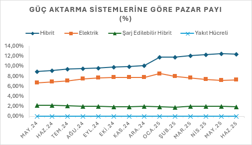 Haziran 2024’ten Haziran 2025’e kadar geçen sürede hibrit araçların pazar payı %8,9’dan %12,4’e yükselerek istikrarlı bir artış gösterdi ve tüketicilerin bu teknolojiye yöneldiğini ortaya koydu. Elektrikli araçlar ise Ocak 2025’te %8,5 ile zirveye ulaşmasına rağmen sonraki aylarda düşüş yaşadı ve Haziran 2025’te %7,3 seviyesinde kaldı; bu da yılın başında tarifeler veya teşvikler nedeniyle öne çekilen talebin etkisini yitirdiğini gösteriyor. Şarj edilebilir hibritlerin payı hafif gerileyerek %1,9’a düşerken, yakıt hücreli araçların pazar payı tüm dönem boyunca %0’da kalarak henüz yaygınlaşmadığını kanıtladı. Genel olarak, tüketicilerin menzil ve altyapı gibi kaygılarla elektrikliye geçişte temkinli davrandığı, bu nedenle hibritlerin kısa vadede daha hızlı büyüme gösterdiği görülüyor.