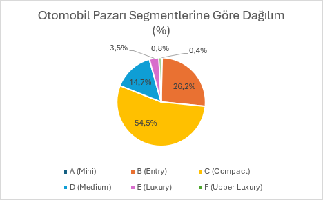 Otomobil pazarında segmentlere göre dağılıma bakıldığında, en büyük payın %54,5 ile C Segmenti yani kompakt araçlar olduğu görülmektedir. Bu, tüketicilerin genellikle hem ekonomik hem de kullanışlı boyutlarda araçlara yöneldiğini göstermektedir. B Segmenti, yani giriş segmenti araçlar ise %26,2’lik önemli bir paya sahiptir ve pazarın yaklaşık dörtte birini oluşturur. Orta segment (D Segmenti) araçlar %14,7 ile üçüncü sırada yer alırken, lüks segmentler daha küçük paylarla temsil edilmektedir; E Segmenti (lüks) %3,5, F Segmenti (üst lüks) ise %0,8 oranındadır. En küçük pay ise %0,4 ile A Segmenti mini araçlara aittir. Genel olarak, otomobil pazarında orta ve kompakt segmentlerin hâkim olduğu, lüks segmentlerin ise nispeten daha sınırlı bir alana sahip olduğu anlaşılmaktadır. (Grafik IV)’de de görüleceği üzere, C ve B segmentleri pazarın temel dinamiklerini oluşturmakta ve tüketici tercihleri bu doğrultuda şekillenmektedir.