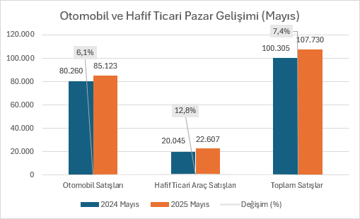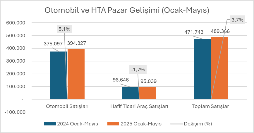 2024 yılının Ocak–Mayıs dönemine kıyasla, 2025 yılının aynı döneminde otomobil satışları %5,1 oranında artış göstermiş ve 375.097 adetten 394.327 adede yükselmiştir. Buna karşılık, hafif ticari araç satışlarında %1,7 oranında bir düşüş yaşanmış, satışlar 96.646 adetten 95.039 adete gerilemiştir. Genel toplamda ise araç satışları %3,7 artışla 471.743 adetten 489.366 adede ulaşmıştır.