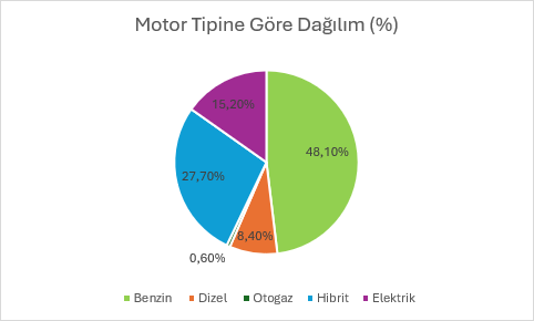 Verilen motor tipi dağılımına göre, benzinli araçlar %48,10 ile hâlâ en yaygın motor tipi konumunda olsa da hibrit (%27,70) ve elektrikli (%15,20) araçların toplamda %42,9 gibi yüksek bir orana ulaşması, kullanıcı tercihlerinin giderek çevre dostu ve sürdürülebilir teknolojilere yöneldiğini göstermektedir. Dizel araçların payı %8,40 ile oldukça düşükken, otogazlı araçlar ise %0,60 gibi çok sınırlı bir kullanım oranına sahiptir. Bu dağılım, fosil yakıtlı araçlardan uzaklaşma eğilimini ve alternatif enerji kaynaklı araçların yükselişini net biçimde ortaya koymaktadır. (Grafik V)’te de görüleceği üzere, motor tiplerine göre pazarın dönüşümü açıkça gözlemlenmektedir.