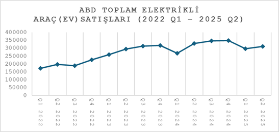 ABD'de 2025'in ikinci çeyreğinde toplam elektrikli araç (EV) satışları, bir önceki yılın aynı çeyreğine göre %5,9'luk düşüş yaşasa da, yılın ilk çeyreğine kıyasla %4,9'luk bir toparlanma sergileyerek 310.839 adede ulaştı.