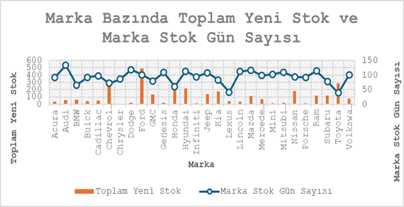 Marka stok verilerine göre, Ford 488.802 adetle en yüksek stok miktarına sahipken, onu Chevrolet (319.517) ve Toyota (284.481) takip etti. Stok gün sayısında ise en düşük süreler Toyota (39 gün) ve Lexus'ta (41 gün) görülürken, en yüksek stok gün sayısı Audi (133 gün) ve Dodge (118 gün) markalarında kaydedildi. Yüksek stok hacmi ve uzun bekleme süreleri, özellikle Ford, Hyundai ve Honda gibi büyük üreticilerde, otomotiv sektöründeki arz-talep dengesizliğinin devam ettiğini gösteriyor. Bu durum, ya talepte bir yavaşlama olduğunu ya da satış hızının stokları eritmekte yetersiz kaldığını ortaya koyuyor. Öte yandan, Toyota ve Lexus'un düşük stok gün sayıları, bu markaların talebe daha dinamik bir şekilde yanıt verdiğini veya üretim ve dağıtım süreçlerini daha etkili yönettiğini düşündürüyor.
