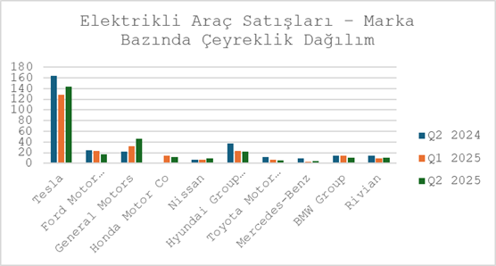 Marka bazında incelendiğinde Tesla, 143.535 adetle liderliğini korusa da, Q2 2024’e göre yaklaşık %13’lük bir düşüş yaşadı. Bu düşüşün aksine, GM %111’lik artışla 46.280 adet satarak dikkat çekici bir yükseliş gösterdi. Ford ise %31 düşüşle 16.438 adede geriledi. Hyundai Grubu, yüksek bir baz yılına rağmen 21.493 adetlik satışla pazardaki önemli oyunculardan biri olmaya devam etti. Honda, Toyota ve Nissan gibi Asyalı markalar sınırlı katkı sunarken, BMW, Mercedes-Benz ve Rivian gibi üreticiler segmentin istikrarını destekledi. Ancak, ikinci çeyrekteki bu genel yavaşlama, tüketici talebindeki duraksama ve teşviklerin yakında sona erecek olmasıyla ilişkilendiriliyor. Bu duruma rağmen, vergi teşviklerinin sona erecek olması nedeniyle yılın üçüncü çeyreğinde kısa vadeli bir satış ivmesi bekleniyor.