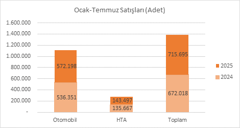 2025 yılının Ocak-Temmuz döneminde otomobil satışları bir önceki yılın aynı dönemine göre %6,68 artarak 572.198 adede ulaşırken, hafif ticari araç satışları da %5,77 artışla 143.497 adede yükseldi. Böylece toplam araç satışları %6,5 artışla 715.695 adet olarak gerçekleşti. Bu veriler, otomotiv pazarında genel bir canlanma ve talep artışının sürdüğünü gösteriyor.