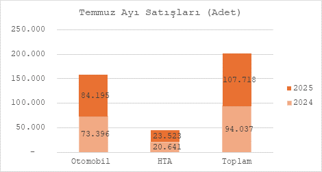 2025 Temmuz ayında otomobil satışları geçen yılın aynı ayına göre %14,71 artarak 84.195 adede ulaşırken, hafif ticari araç satışları da %13,96 artışla 23.523 adede yükseldi. Toplam araç satışları ise %14,55 artışla 107.718 adet olarak gerçekleşti. Bu güçlü büyüme, otomotiv pazarında hem otomobil hem de hafif ticari araç segmentlerinde canlı talebin devam ettiğini gösteriyor.