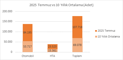 2025 Temmuz ayında otomobil satışları, son 10 yıllık ortalamaya kıyasla %56,7 artışla 84.195 adede yükselirken, hafif ticari araç satışları da %53,1 artışla 23.523 adede ulaştı. Böylece toplam araç satışları, 10 yıllık ortalamaya göre %55,9 artışla 107.718 adet olarak gerçekleşti. Bu veriler, 2025 Temmuz ayının son on yılın ortalamasına kıyasla oldukça güçlü bir satış performansına işaret ettiğini gösteriyor.
