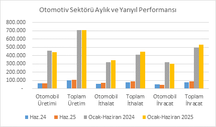 Haziran 2025’te otomobil üretimi, geçen yılın aynı ayına göre %7,1 azalarak 63.918 adede gerilerken; ticari araçlardaki artış sayesinde toplam üretim %7,8 artışla 107.927 adede yükseldi.  Ocak-Haziran 2025 döneminde otomobil üretimi, geçen yılın aynı dönemine göre %4,7 azalarak 439.101 adede geriledi. Bu dönemde toplam üretim, geçen yılki seviyeye yakın seyretti. Otomobil ithalatı Haziran ayında %14,7 artışla 71.082 adet olurken, toplam ithalat %22 artarak 93.095 adede ulaştı. Yılın ilk yarısında otomobil ithalatı, geçen yılın aynı dönemine kıyasla %6,9 artışla 344.506 adet, toplam ithalat ise %10 artışla 448.729 adet oldu. Öte yandan, Haziran ayında otomobil ihracatı %3,5 düşüşle 49.468 adede gerilerken, toplam ihracat %19,8 artarak 90.101 adede çıktı. Ocak-Haziran 2025 döneminde otomobil ihracatı, geçen yılın aynı dönemine göre %5,5 azalarak 302.759 adede inerken, toplam ihracat %7,5 artışla 530.322 adede ulaştı. Bu veriler, üretimin ticari araçlarla desteklendiğini, iç talebin ithalatla karşılandığını ve ihracatta özellikle ticari araç gurubunda güçlü seyrin devam ettiğini gösteriyor.